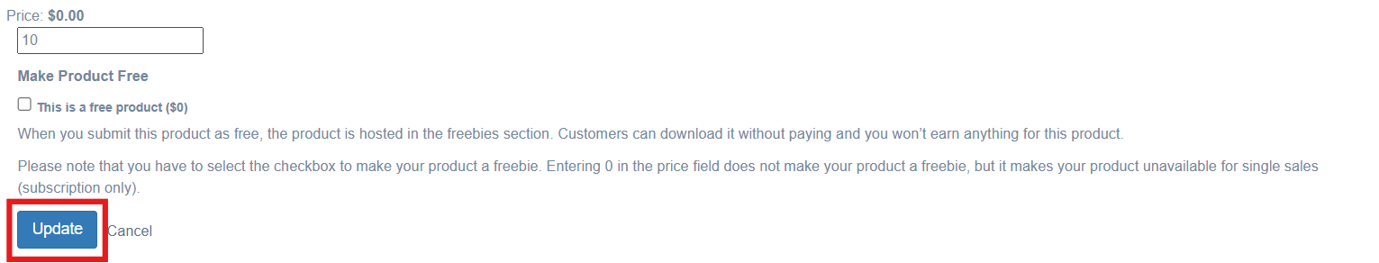 3. Enter the new price and click on the blue Update button.