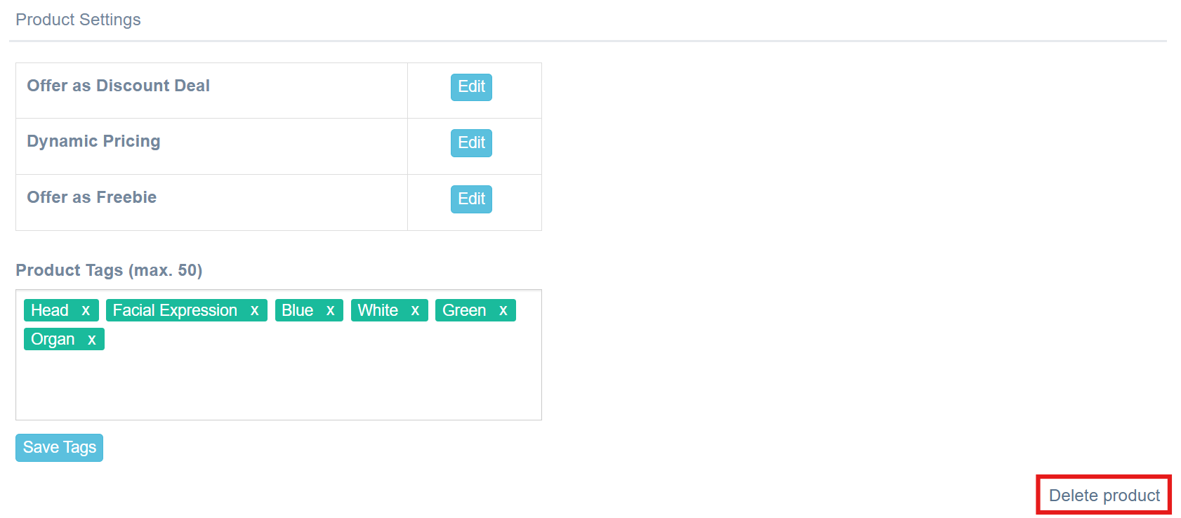 - Now scroll down and find the Product Settings section. Click the Delete product button on the bottom right-side of the page