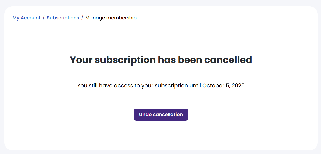 - Click End Subscription to finalise your subscription cancellation. A new page will load and you will see a confirmation that your subscription has ended
