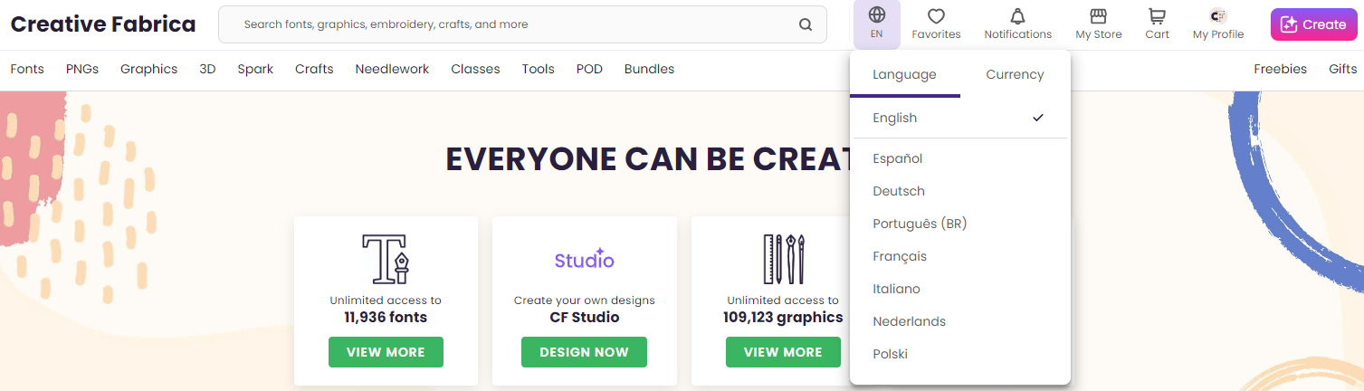 Currently the Creative Fabrica site is available in 8 different languages - English, Spanish, German, Portugese, Dutch, Italian, French and Polish.