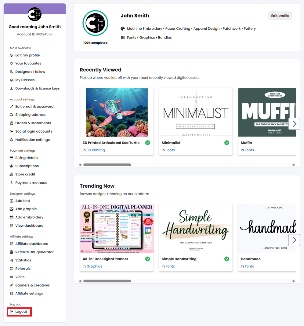 To log out of your Creative Fabrica account visit your account page and click log out as shown below